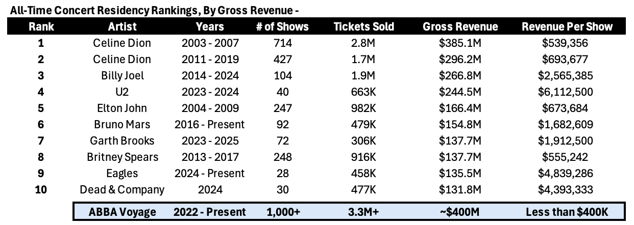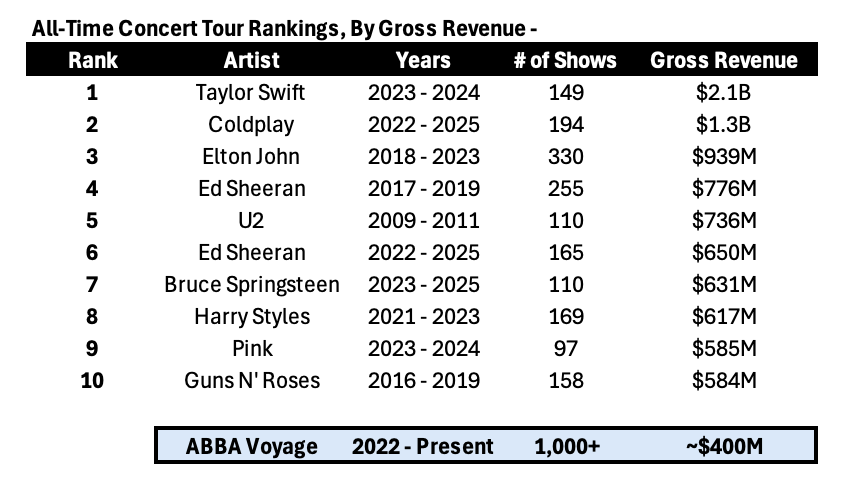 Meanwhile, ABBA Voyage ranks just outside the top 20 highest grossing concert tours of all-time.