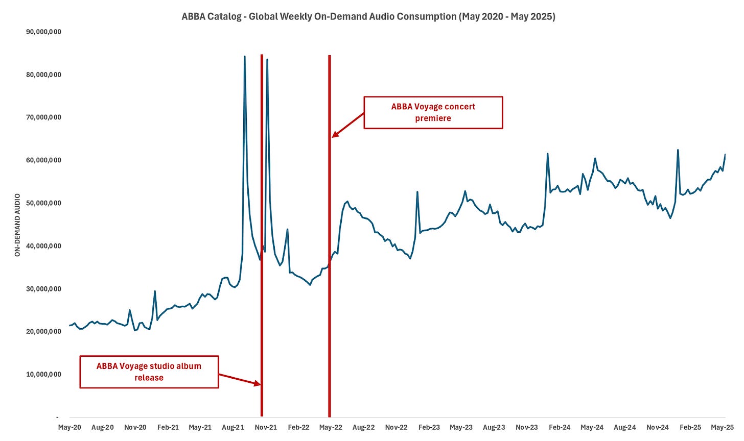 The data suggests that Pophouse’s strategy has worked extremely well for ABBA’s music rightsholders. According to Luminate data, ABBA’s catalog has seen its global weekly on-demand audio streams increase ~3x from May 2020 to May 2025! In other words, ABBA Voyage’s success appears to have produced a positive halo effect for ABBA’s music catalog.