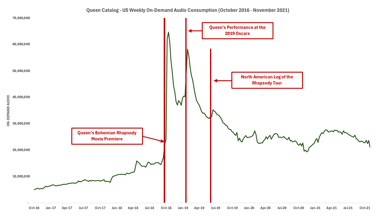 1) IP Expansion: This involves expanding an artist’s music and brand into new formats, such as interactive museums, dining experiences, biopics, avatar concerts, and more. By doing this, the goal is to expand that artist’s audience and reach. In interviews, Per Sundin has highlighted his admiration for what Disney has done with legacy IP like Marvel and Star Wars. Similarly, Sundin has pointed out how the Queen-based Bohemian Rhapsody movie led to a massive increase in demand for the band’s music. As pictured below, this is confirmed by Luminate data, which shows that Queen’s US weekly on-demand audio streams saw a ~400% spike following the release.