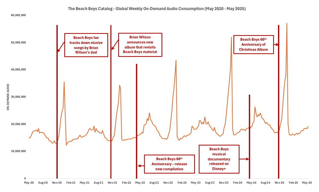 The Beach Boys music and NIL rights were acquired by music IP investor Iconic Artists Group in 2021. According to Luminate data, the catalog has seen short-term spikes in consumption during specific events over the past 5 years. However, the catalog’s baseline growth has only increased modestly.