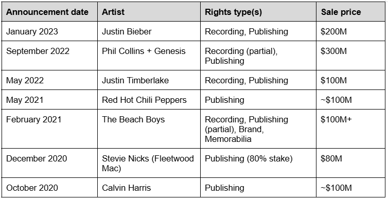 With $900 million of equity left — the remaining 70% of its funding round — and depending on the amount of borrowing capacity and the number of future deals pursued, we estimate that the team likely has an average of $200 million to $450 million to spend on each individual deal. For context, below is a list of a few recent catalog sales in that price range. While only the Beach Boys sale included the sort of brand rights that Pophouse is after, it’s clear that a $200+ million check size could go a long way, and enable the team to court superstar artists.