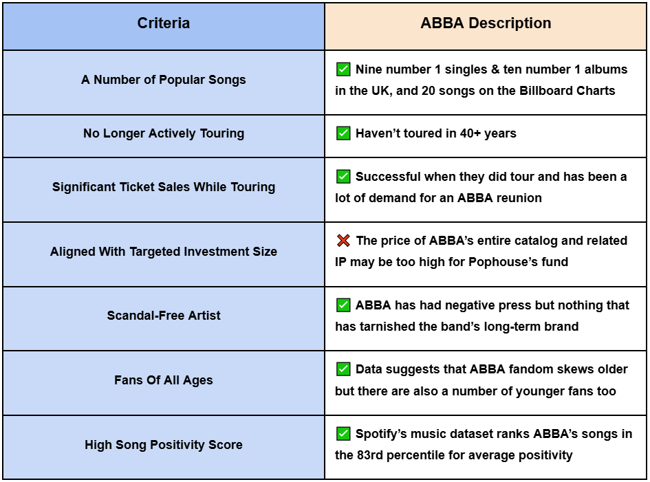 Before wrapping up, we thought it would be fun to speculate on catalogs that may be prime acquisition candidates for Pophouse. To do so, we developed the below framework of 7 criteria to guide our search and applied it to ABBA, based on our research for this article. Note that some of Pophouse’s catalogs (e.g., Swedish House Mafia) don’t check every criteria on our list, but we’d still expect catalogs, particularly those that have avatar concerts, to check most of them.